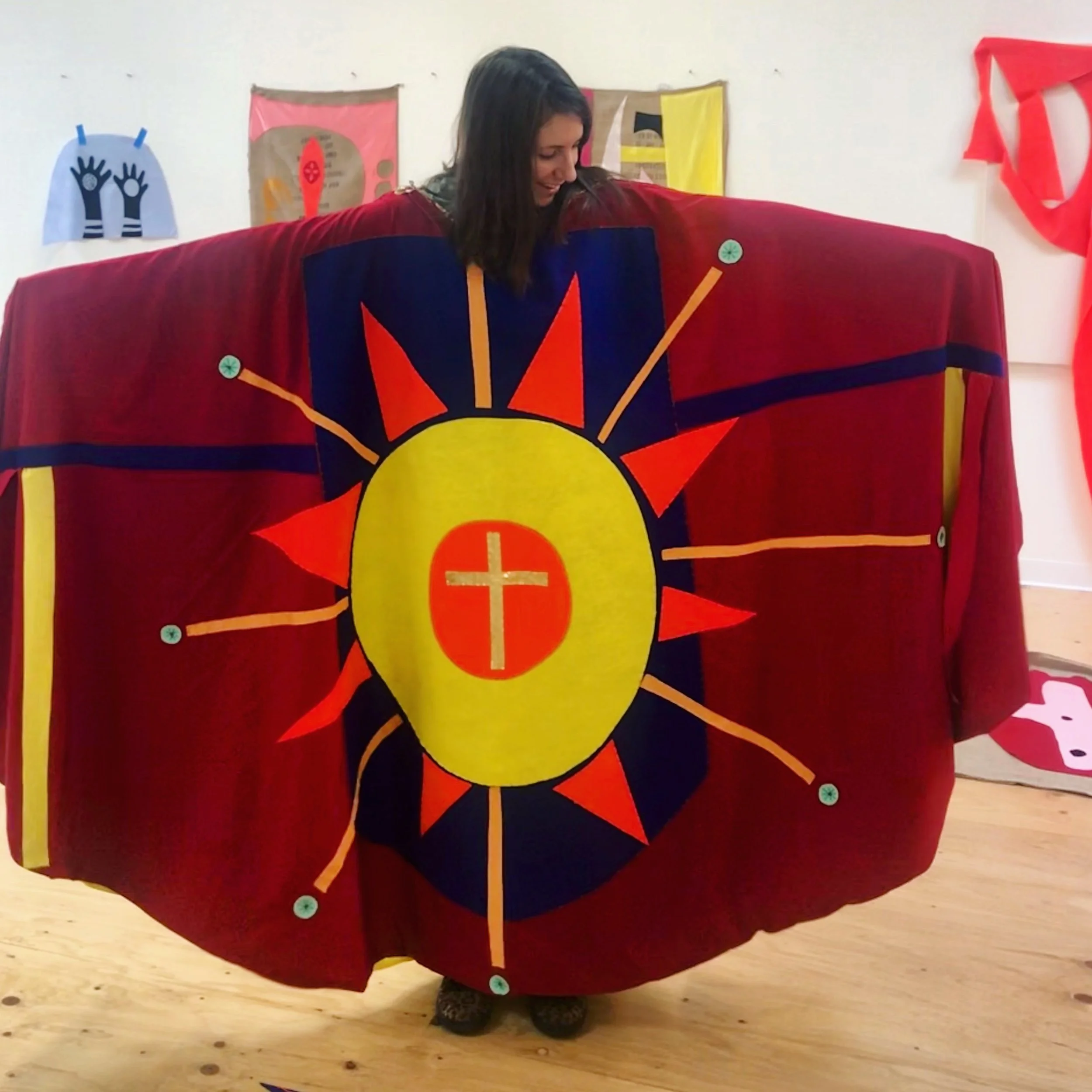 Back inside Craig’s studio, I tried on the Anti-Deportation Cape. The maroon cape was large, and the weight of the felt was heavy on my body as I raised my arms. A large golden cross inside an orange and yellow sun covered the front of my body. The imagery and shape of the garment felt liturgical, and my mind wandered to places where I had seen similar robes: church ceremonies and graduation events, in particular. As a material, felt can feel crafty, but inside Craig’s cape, this connotation was swapped for the aura of regalia, the slow pace of each unhurried stitch a sharp contrast to the speed of my life. In that moment, I wished I gave more of my time to simpler and singular tasks like sensing the folds of fabric on my body.