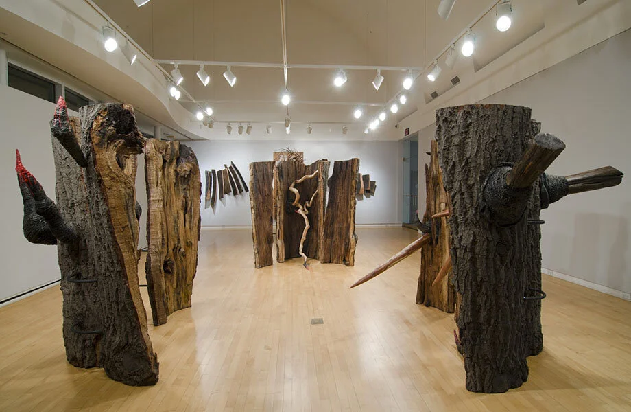 Trees are a recurring theme within Saccio’s pieces, many of which explore the slow and inevitable decomposition of these organic bodies. The impetus for this emphasis on decay comes from a personal tragedy: Saccio’s 12-year-old son Milos was fatally struck by a bus crossing the street on Whitney Avenue in 1979. Reeling from this loss, Saccio rented his first studio inside an old factory along the Quinnipiac River, explaining, “The death of my son strengthened the need to express loss and redemption through making art.” Many of his early sculptures were memorials to Milos which incorporated scraps of his clothing. He planted a weeping beech tree at Foote School in his son’s memory, too.