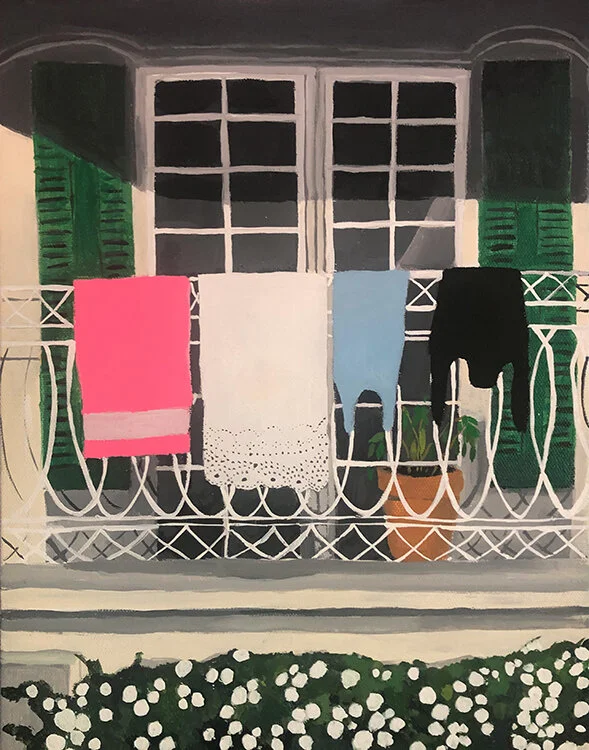 Polly Shindler, Balcony Clothesline with Snowball Virbunum Shrub, (2021). Acrylic on canvas, 20 by 16 inches. Image courtesy of the artist.