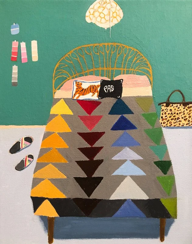 Polly Shindler, Bedroom with Paint Samples, 2020; 14 x 11 inches, Acrylic on canvas.